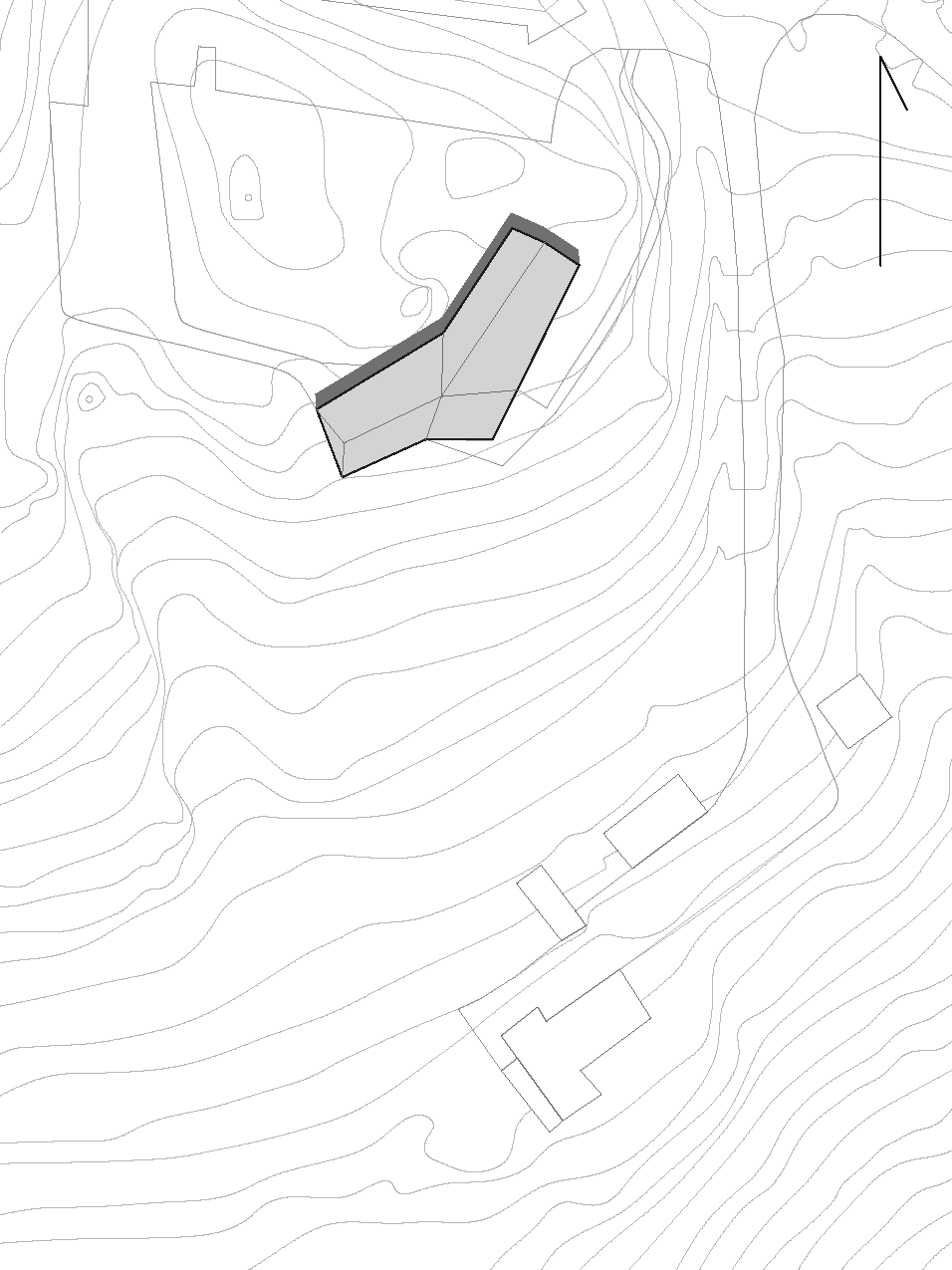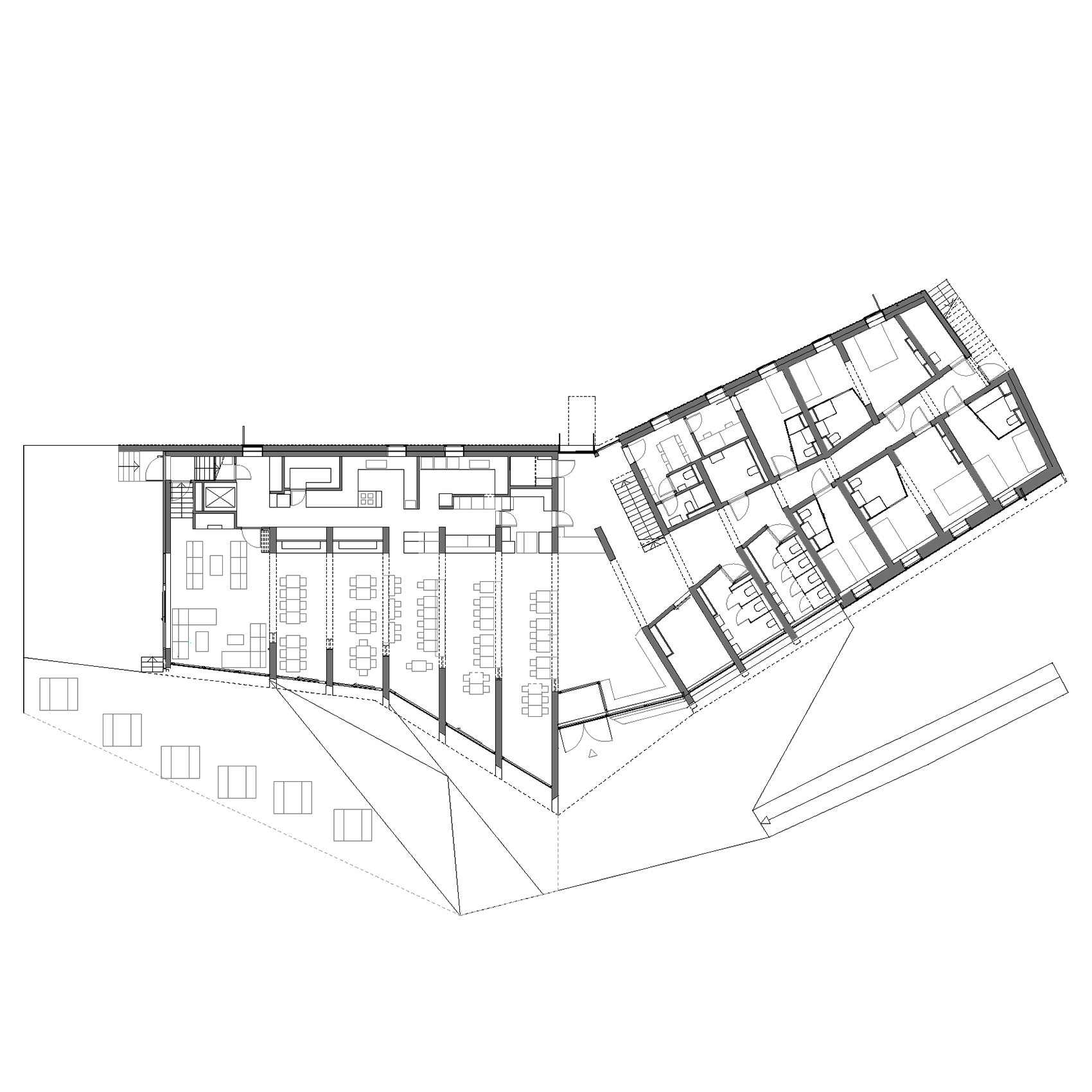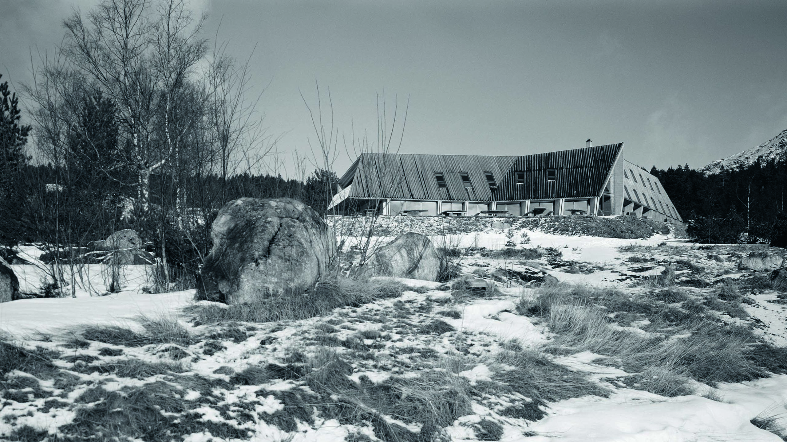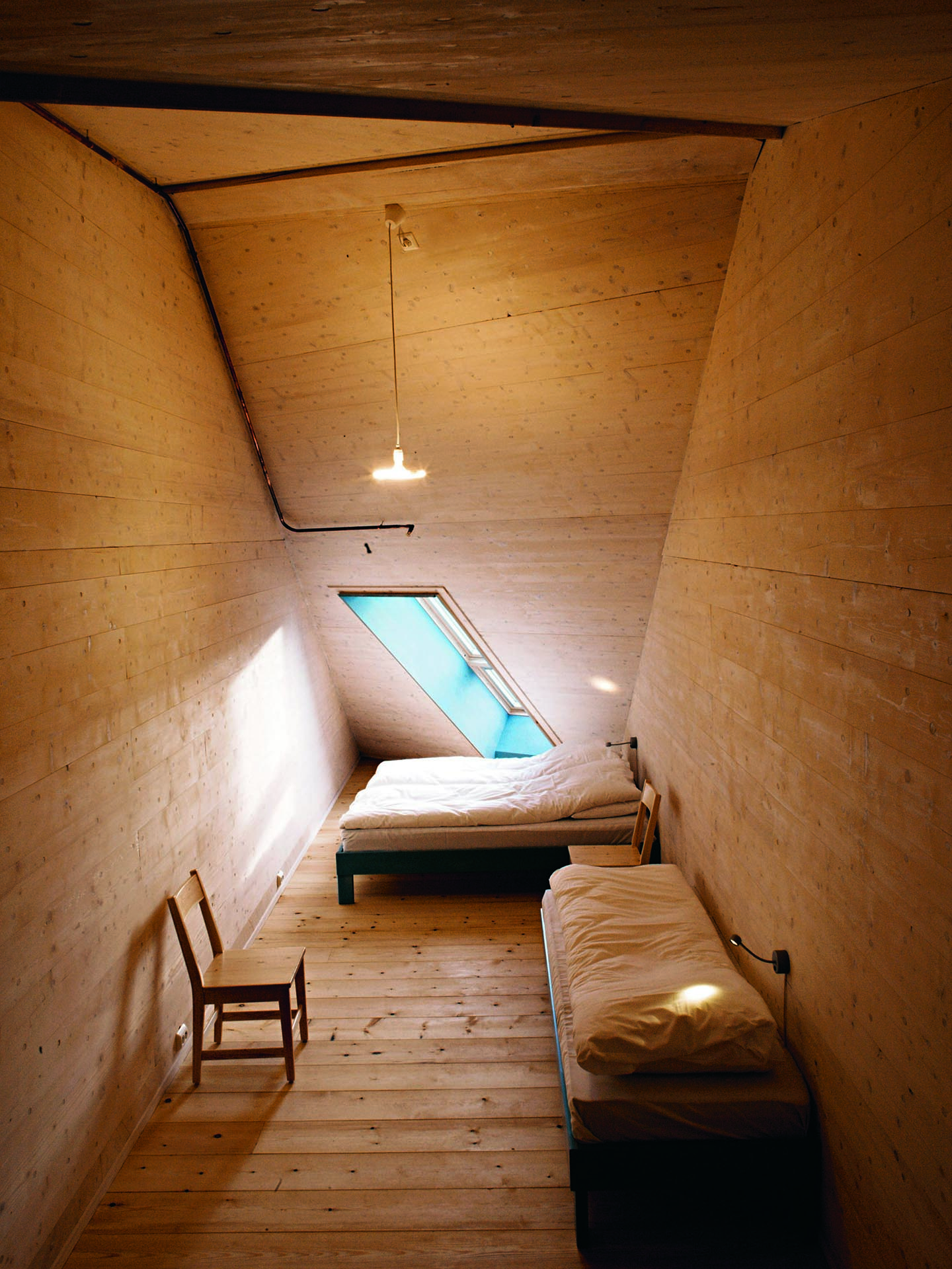 Shaped in dialogue with the landscape, the lodge consists of a folded roof and a bearing rib structure, built from prefabricated massive timber elements called Holz100. The elements are made with layered planks in different directions joined using beech dowels producing a strong bond without glue. We explored how to make the ribs strong enough to support the wide span over the public spaces. The answer was to turn the build-up of the elements inside out, thereby changing the entire geometry of the room.
