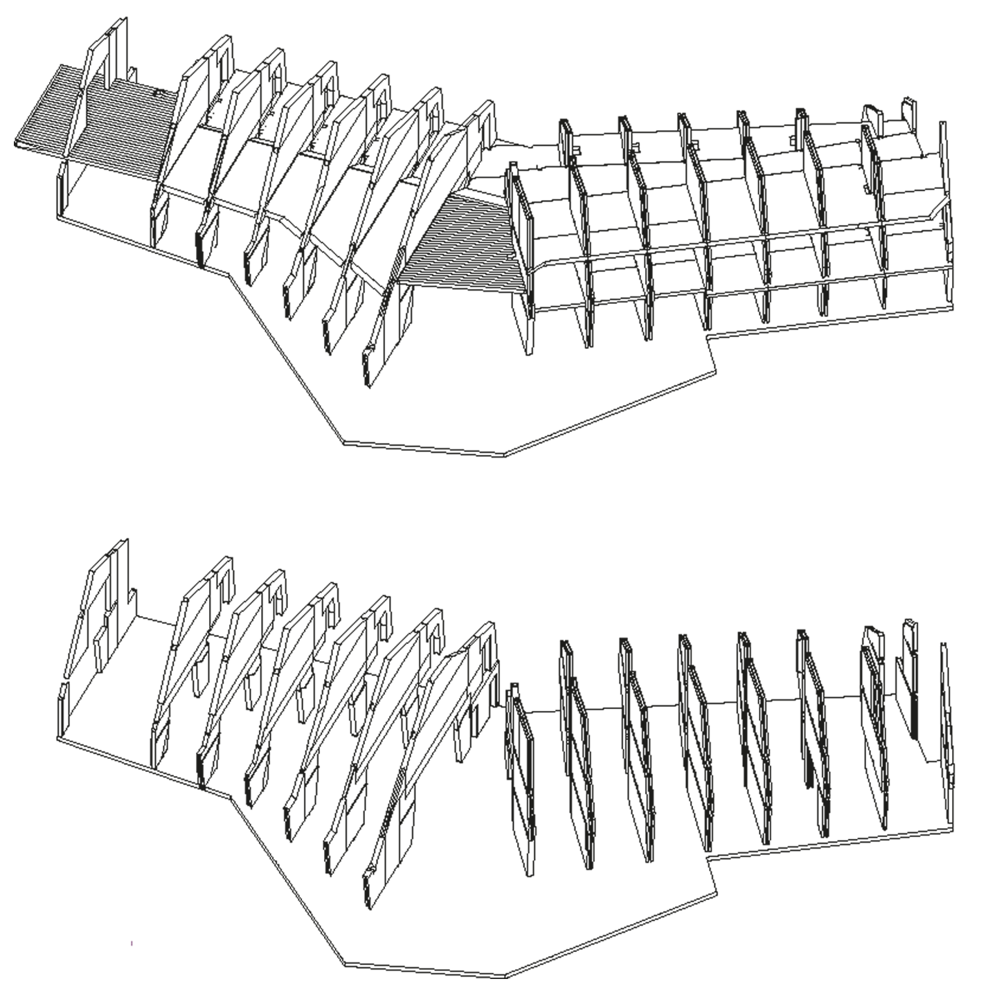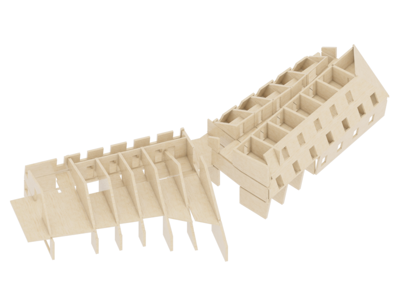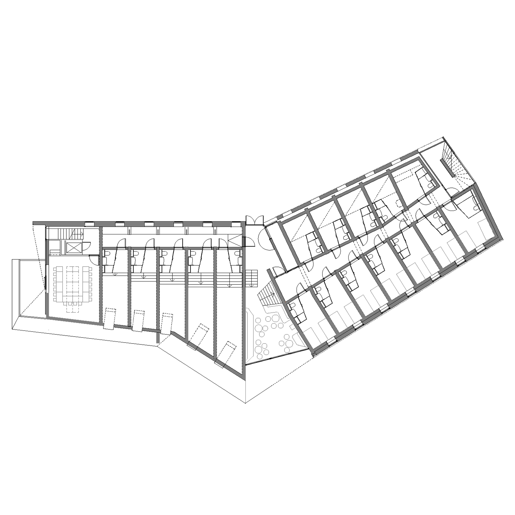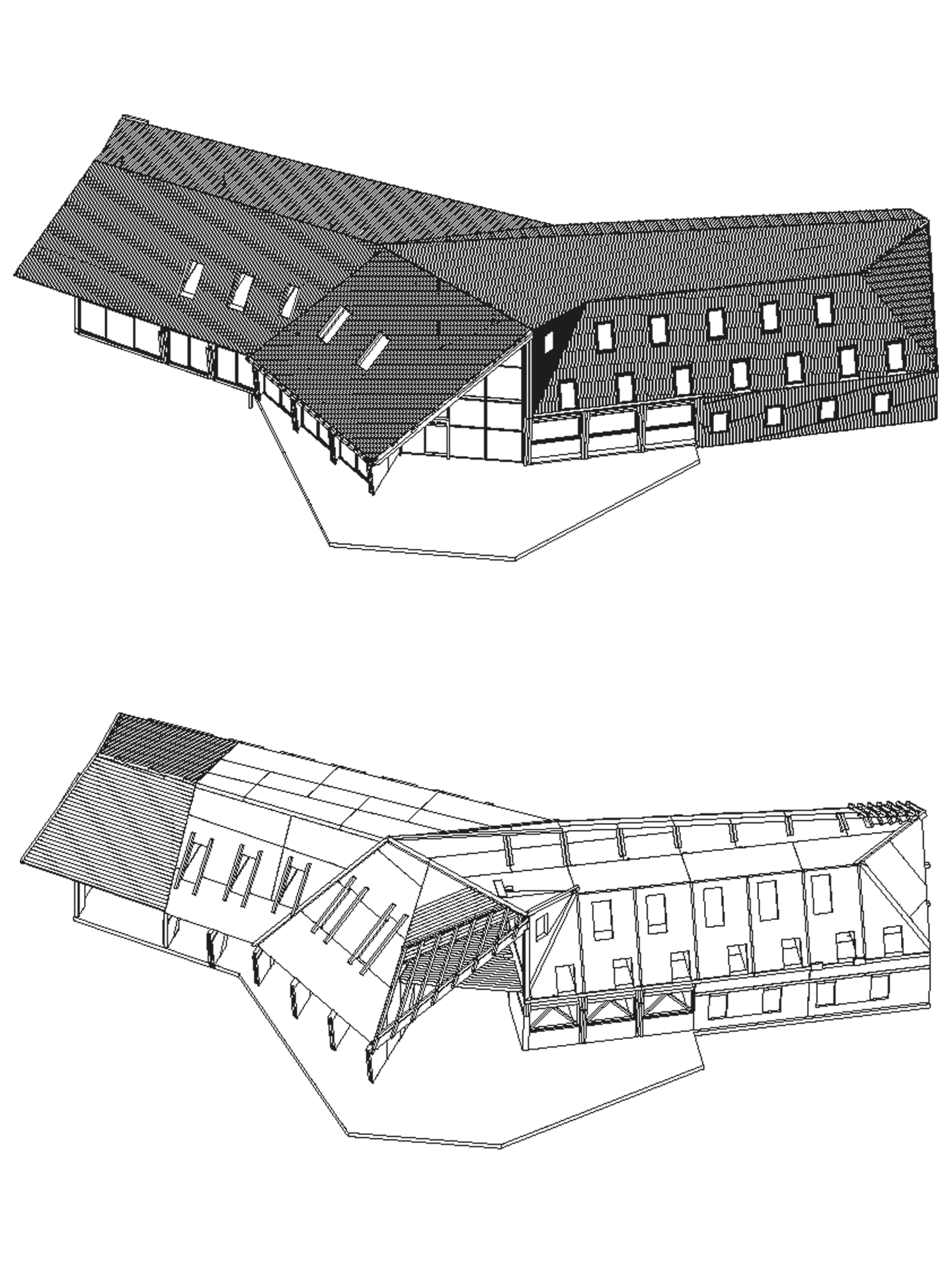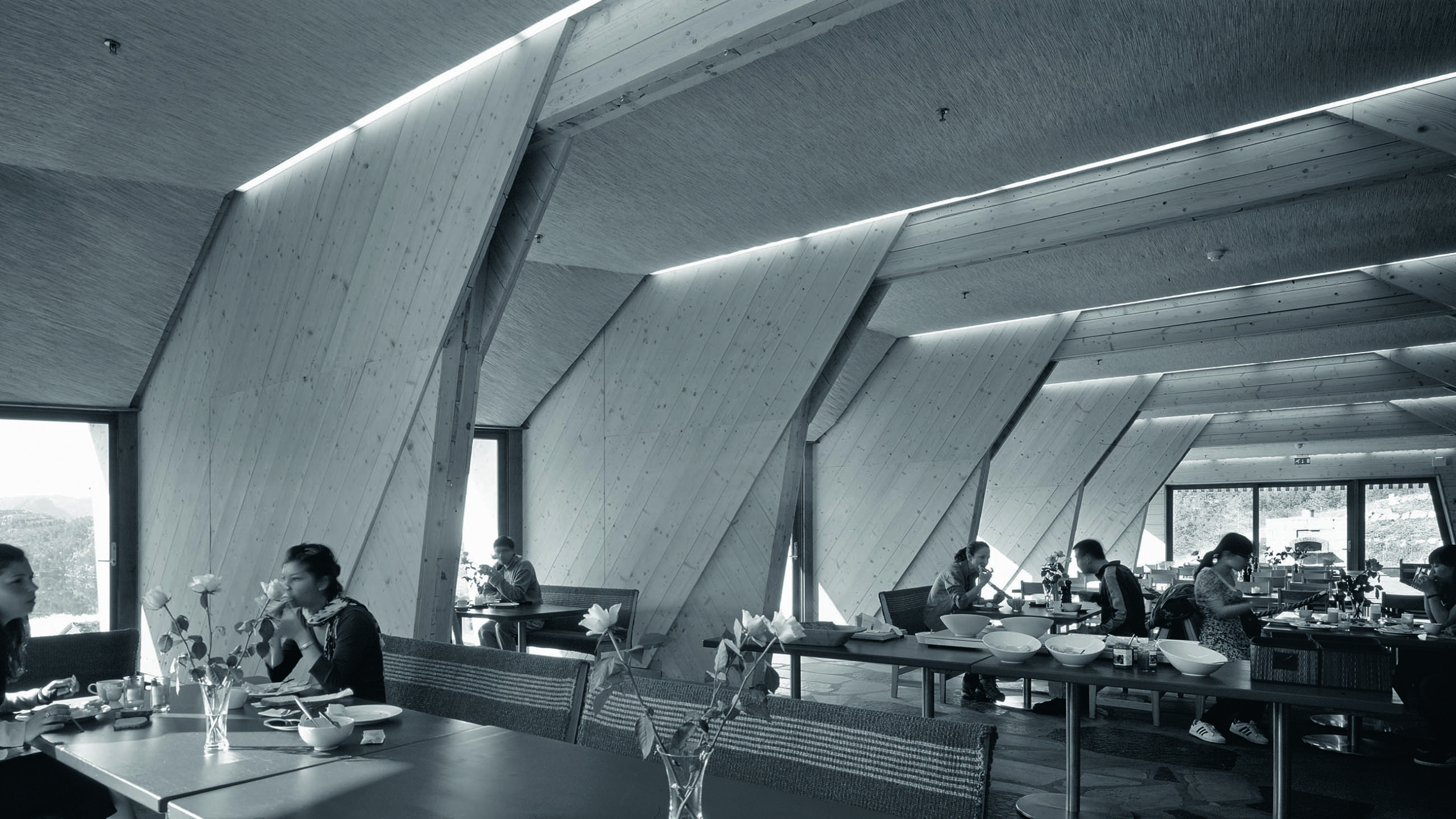 With the aid of 3D modelling, we explored how to make the ribs strong enough to support the wide span over the public spaces, where the two wings of the lodge join. The answer was to turn the build-up of the elements inside out, thereby changing the entire geometry of the room.
