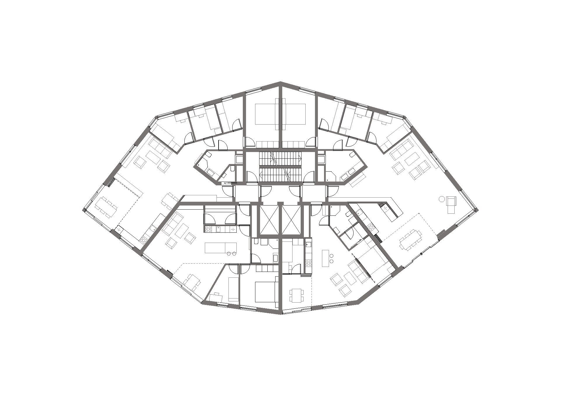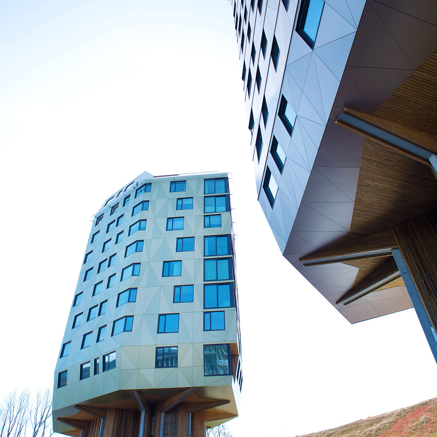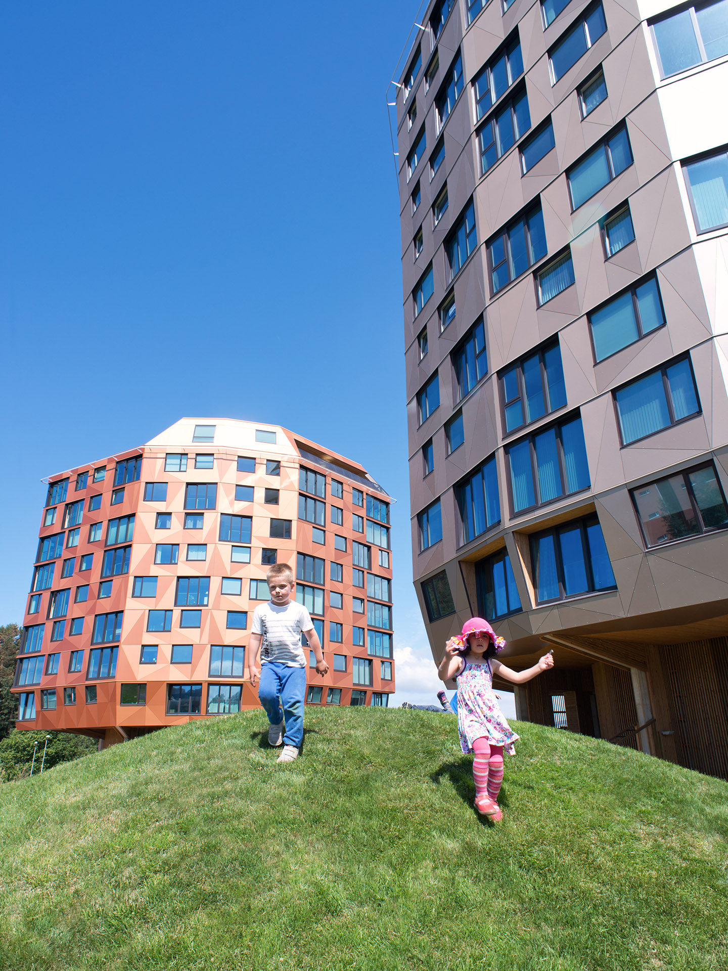The way the sun hits the irregular, triangular-patterned and differently coloured facades, creates a play of light and shadow and breaks down the scale of the towers. Echoing the sculpted, slanted ground and first floors, the top floors slant backwards, reducing in volume, as if to give way to the sun coming over the distant mountains.