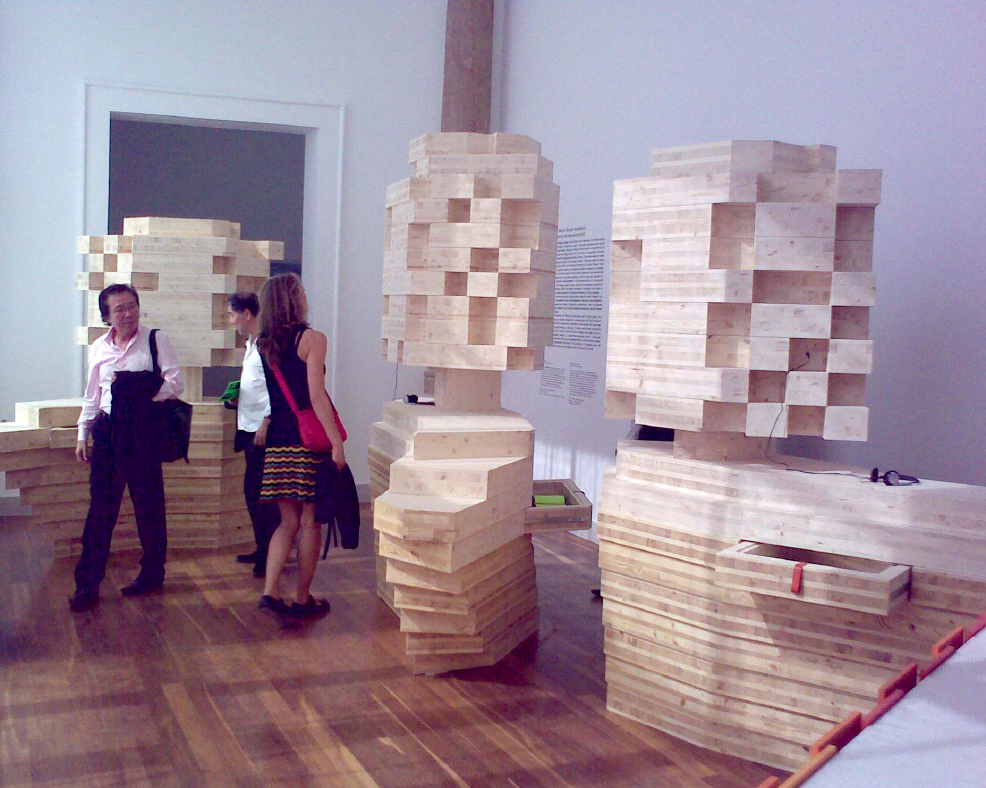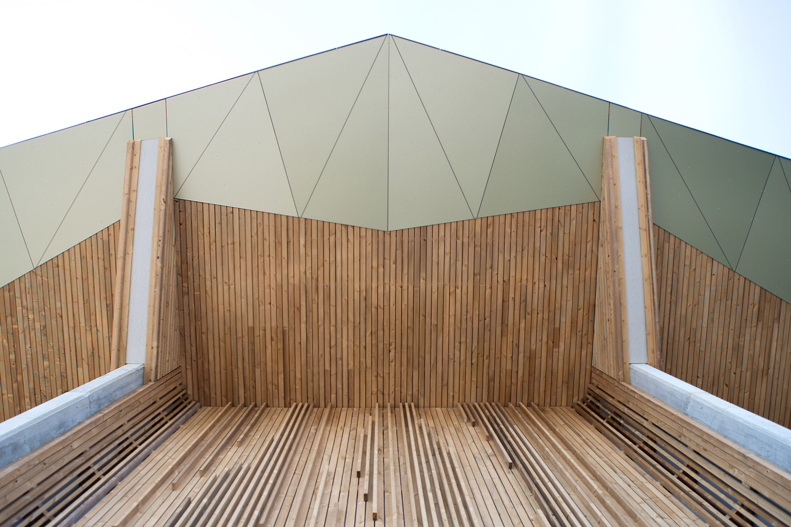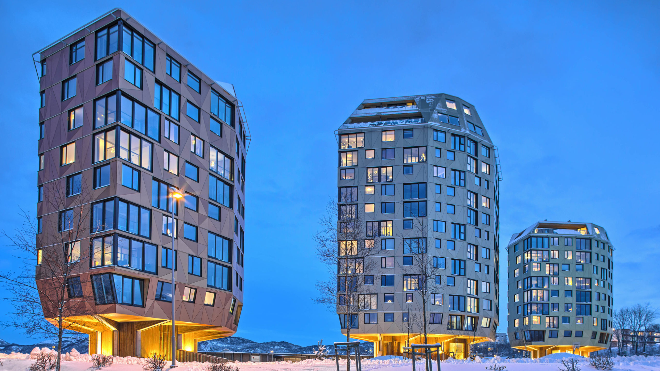 The way the sun hits the irregular, triangular-patterned and differently coloured facades, creates a play of light and shadow and breaks down the scale of the towers. Echoing the sculpted, slanted ground and first floors, the top floors slant backwards, reducing in volume, as if to give way to the sun coming over the distant mountains.