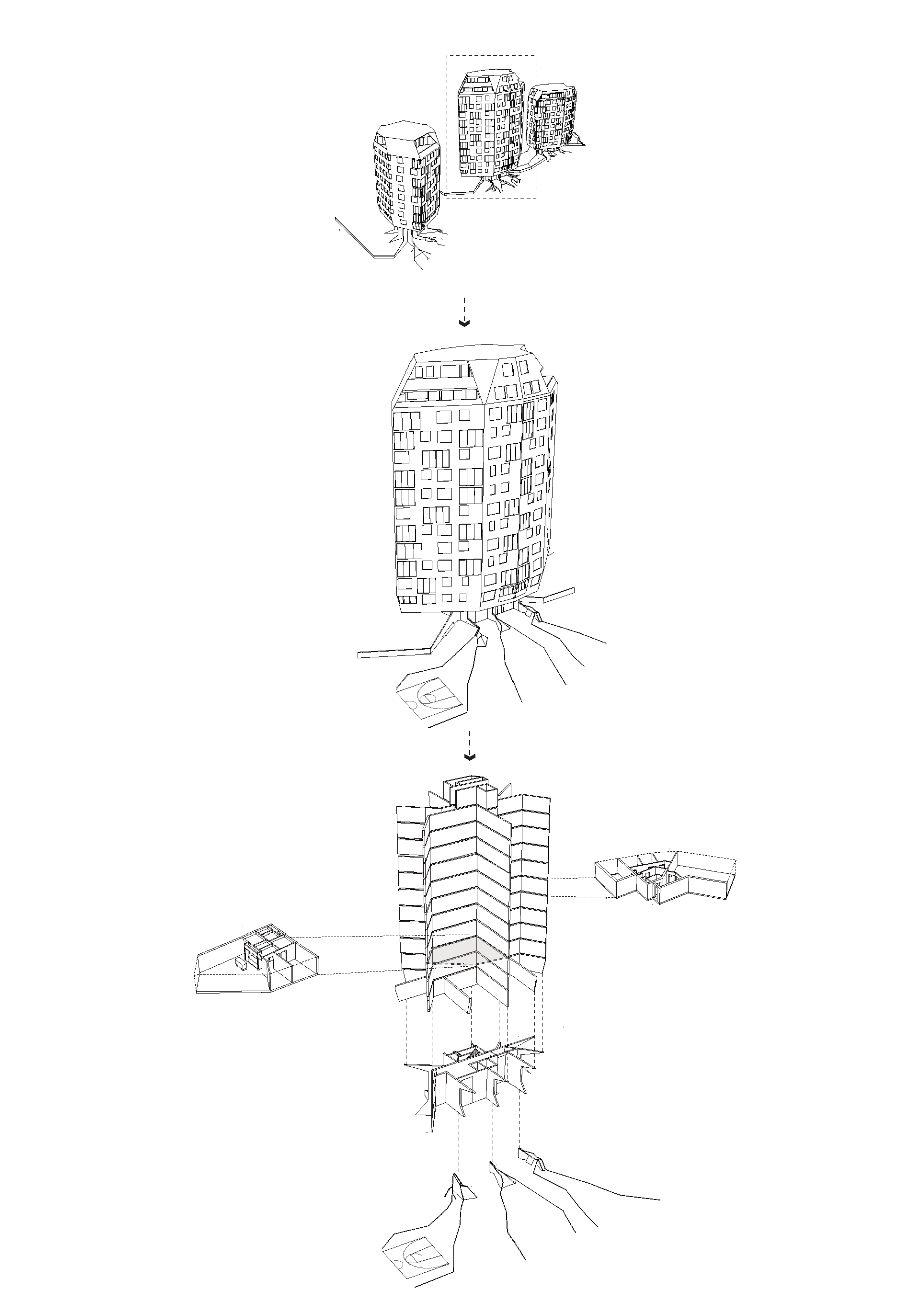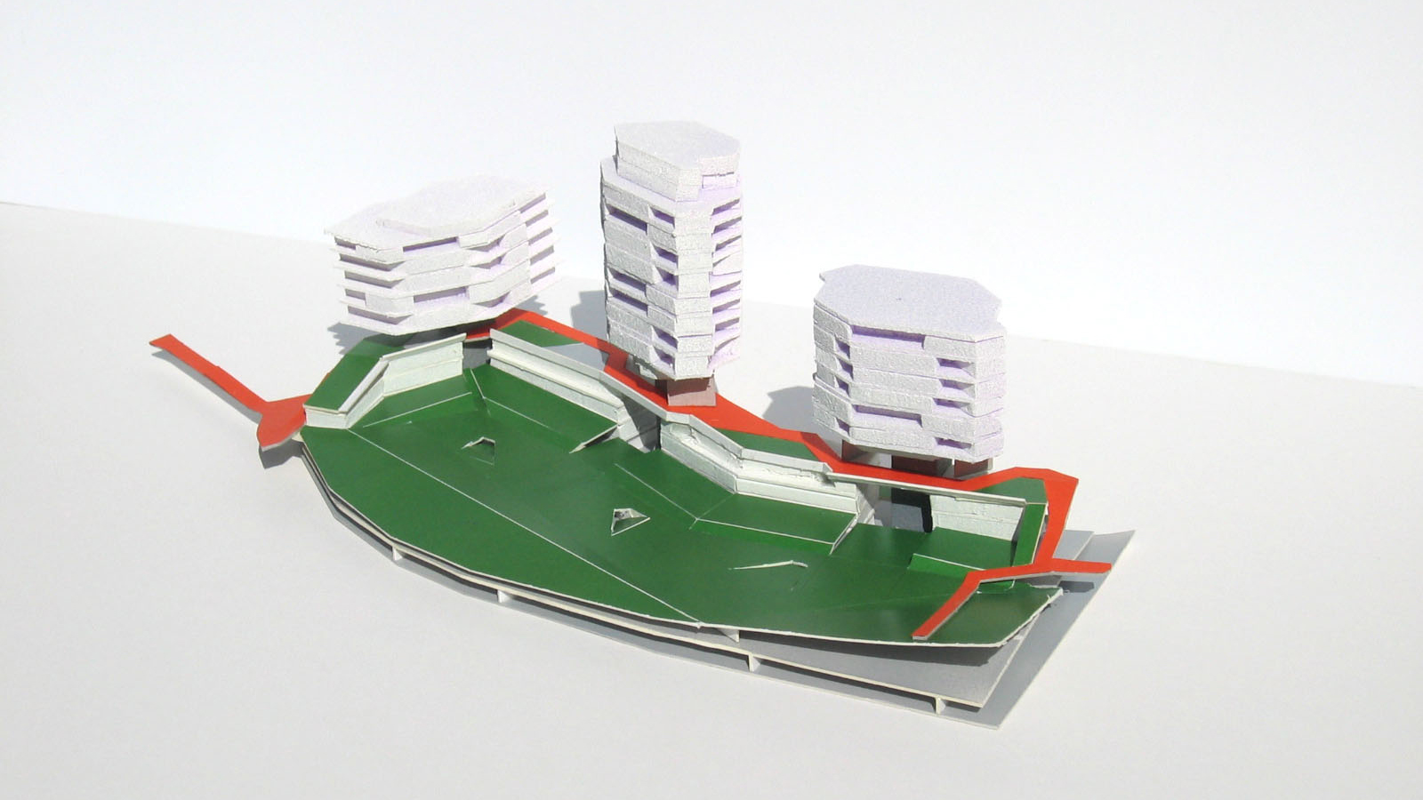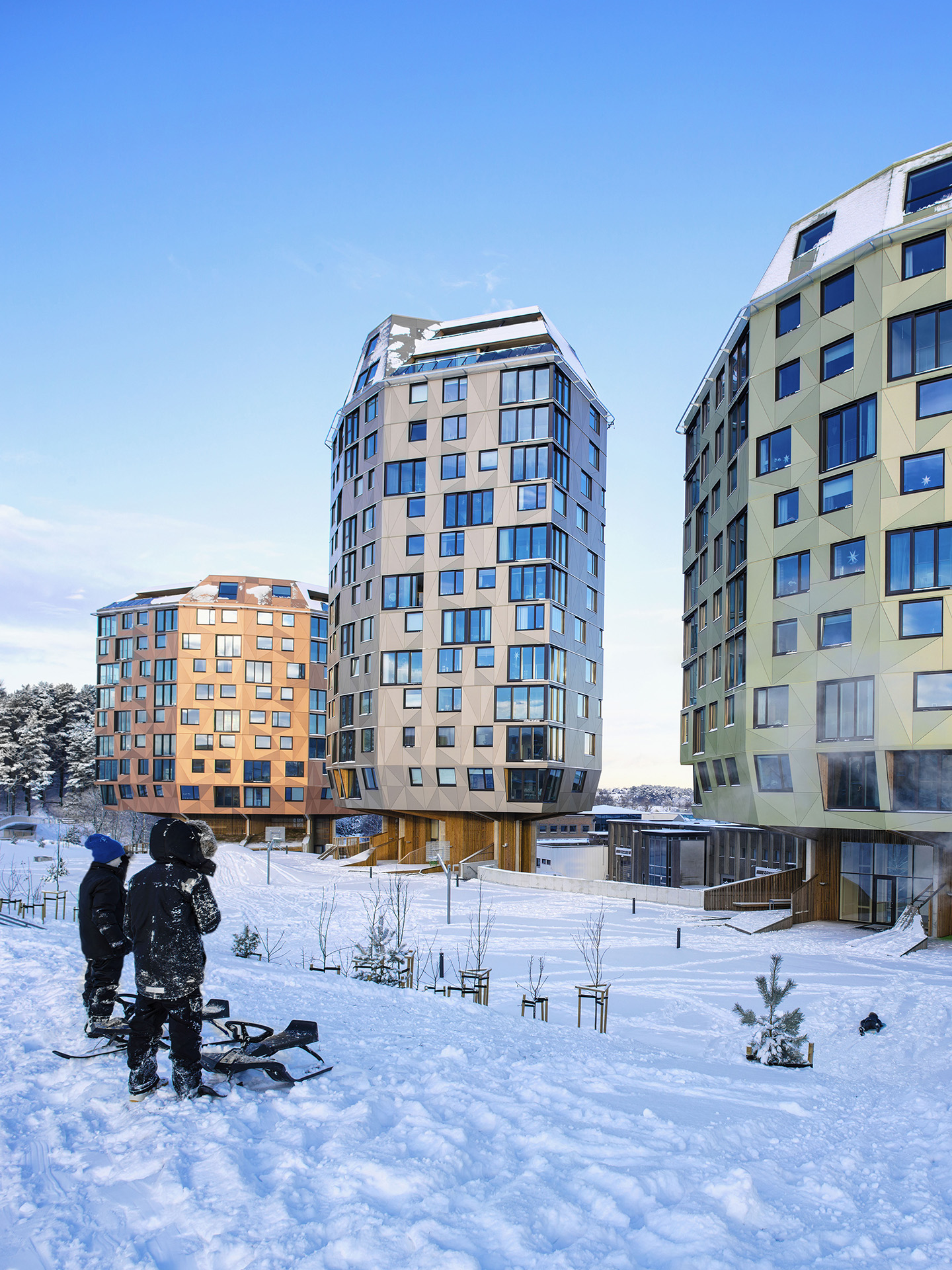 We decided that three towers of differing height – three “trees” with ample space between them – was the best way to make room for 113 new apartments. Our main concern was to design buildings that would become a natural part of their surroundings, made even more critical by the large scale of the project and required density.